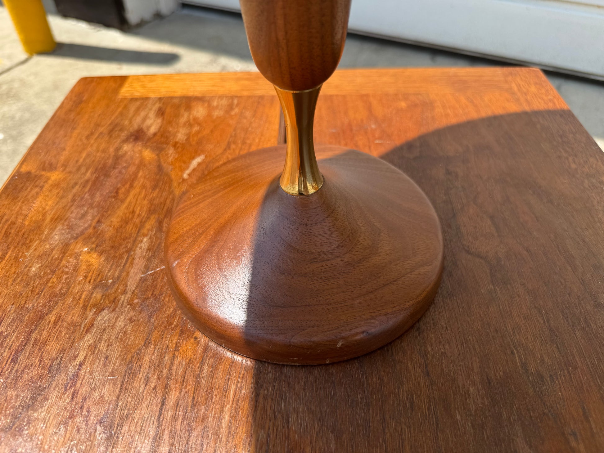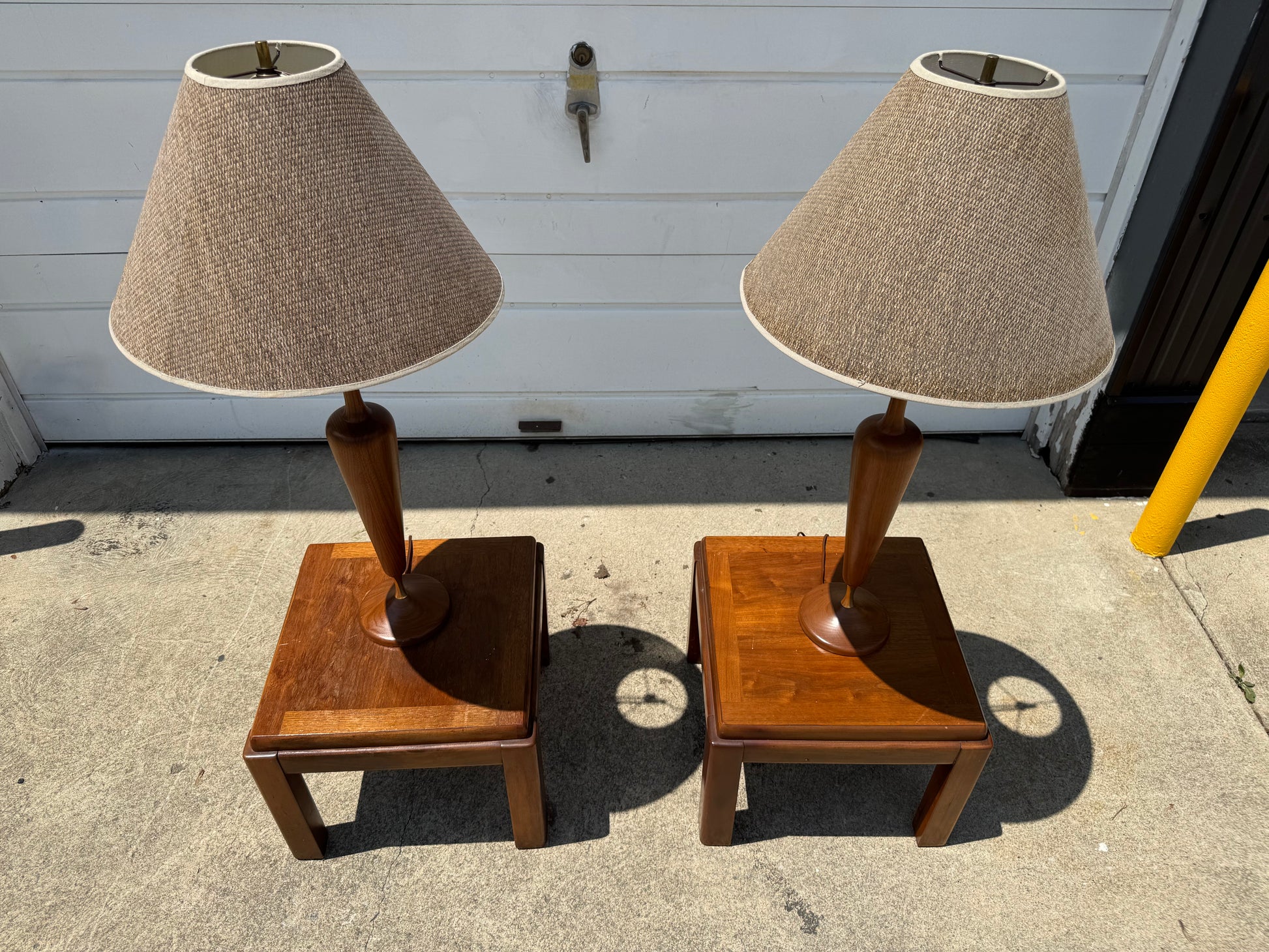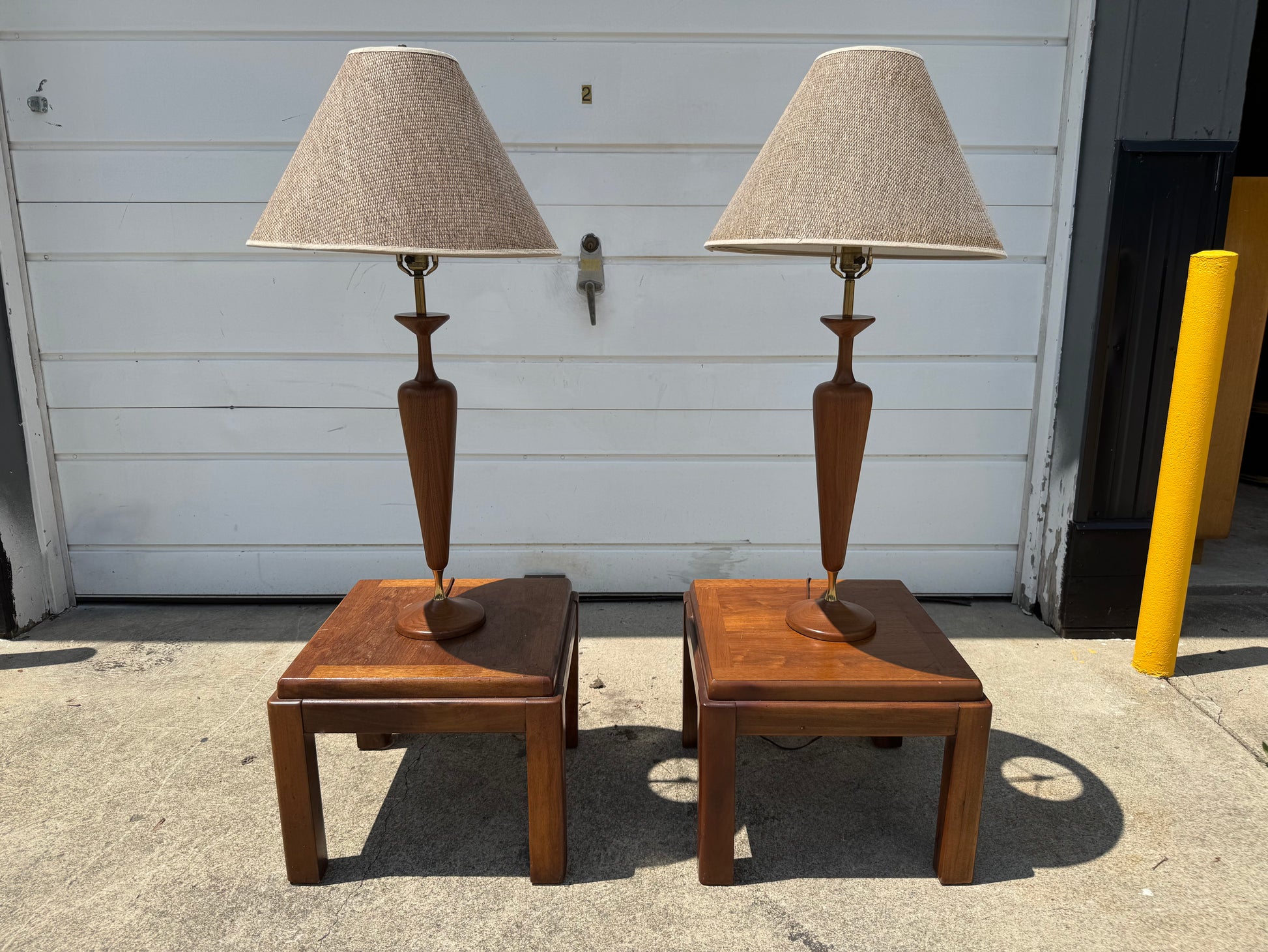 A stunning pair of vintage 1960s wooden lamps, crafted in walnut with clean midcentury lines. Each lamp features a tall, slender form paired with light-toned shades, bringing warmth and elegance to any room. Their timeless design makes them perfect for bedside tables, living room accents, or entryway lighting. *SOLD AS PAIR*