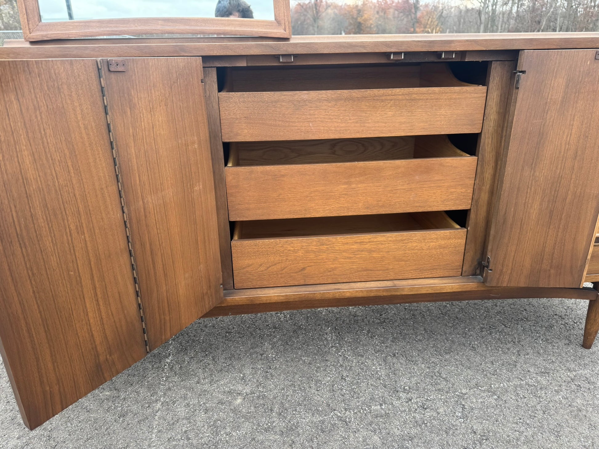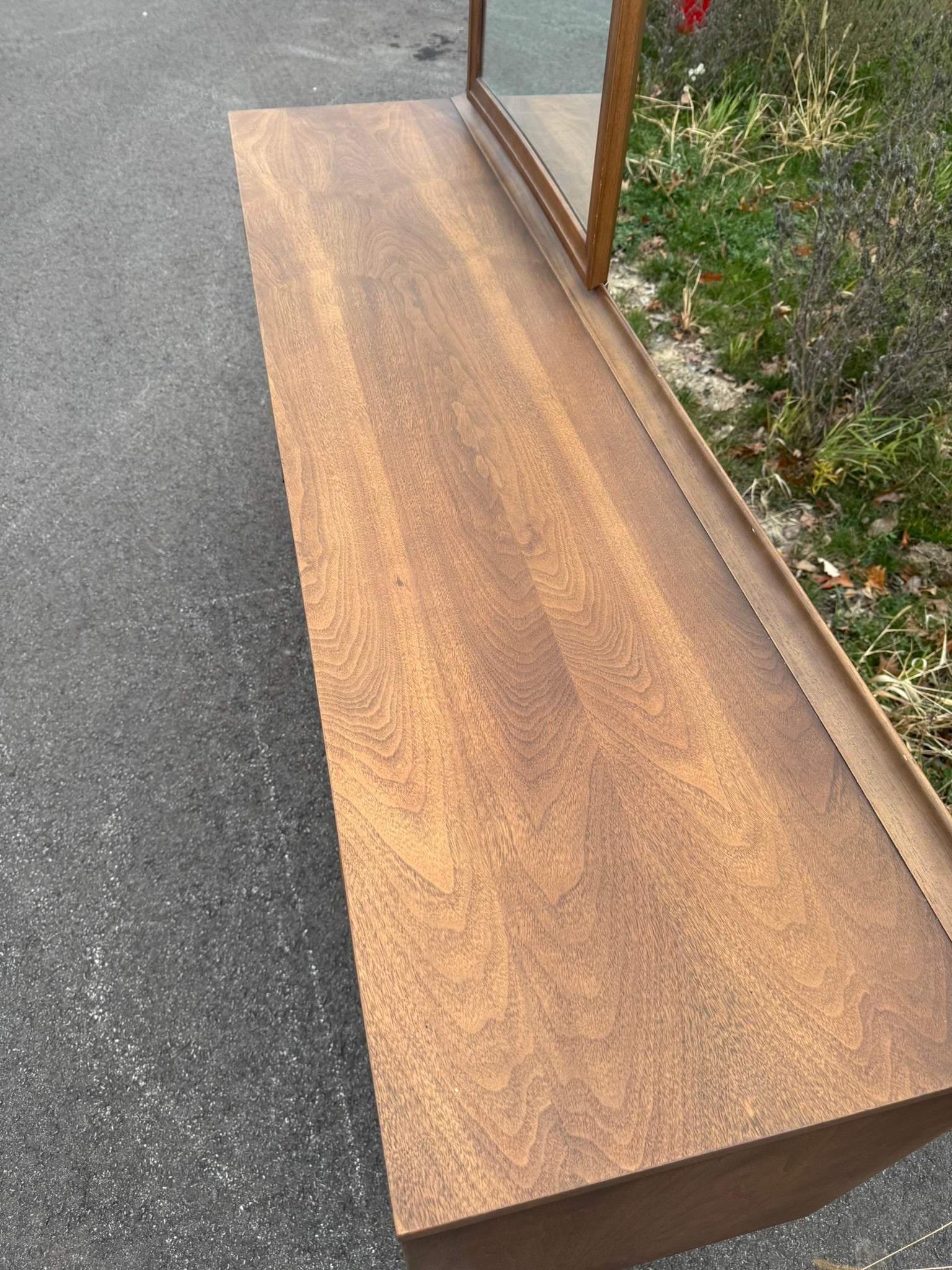 A striking Broyhill Sculpta Series lowboy dresser, complete with its original matching mirror. Known for its sculpted geometric drawer fronts and bold architectural lines, the Sculpta collection delivers some of the most iconic midcentury design elements Broyhill ever produced.