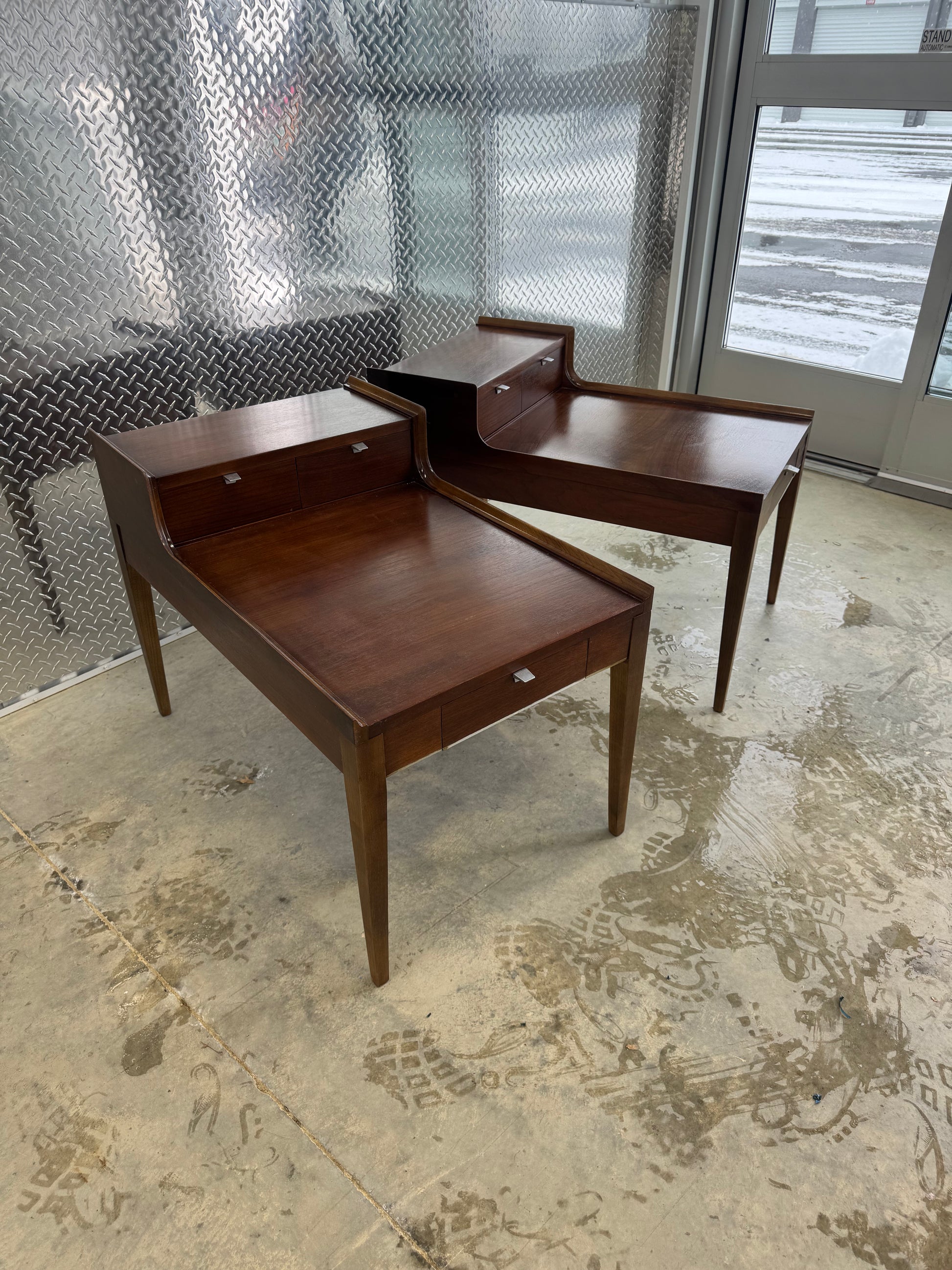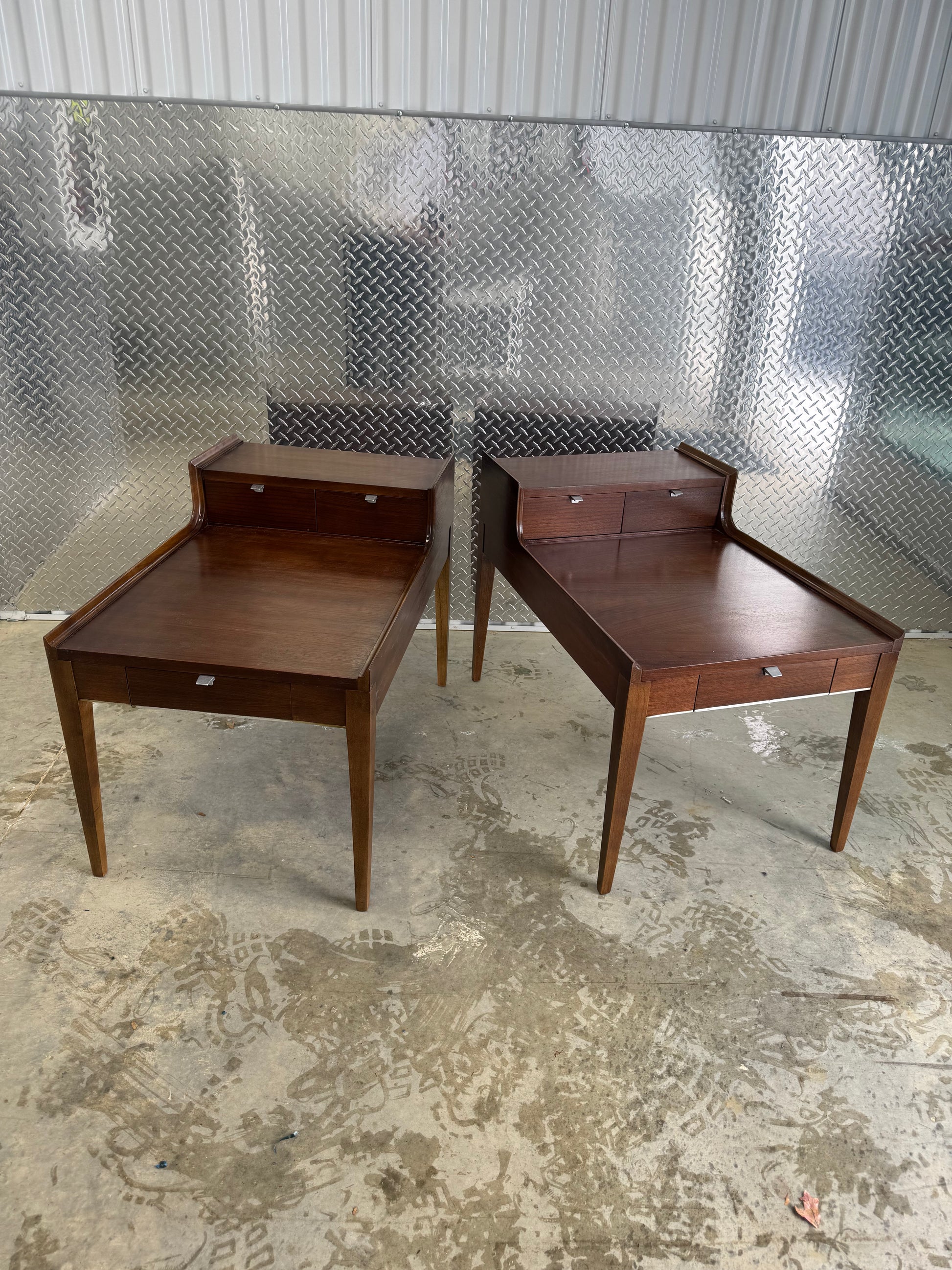 This matching pair of Cavalier Furniture two-tier coffee tables designed by Arthur Umanoff blends classic midcentury modern design with smart, built-in storage. Each table features a dual-level layout and three integrated drawers, offering generous space for books, records, or everyday living room essentials while keeping surfaces clean and intentional.