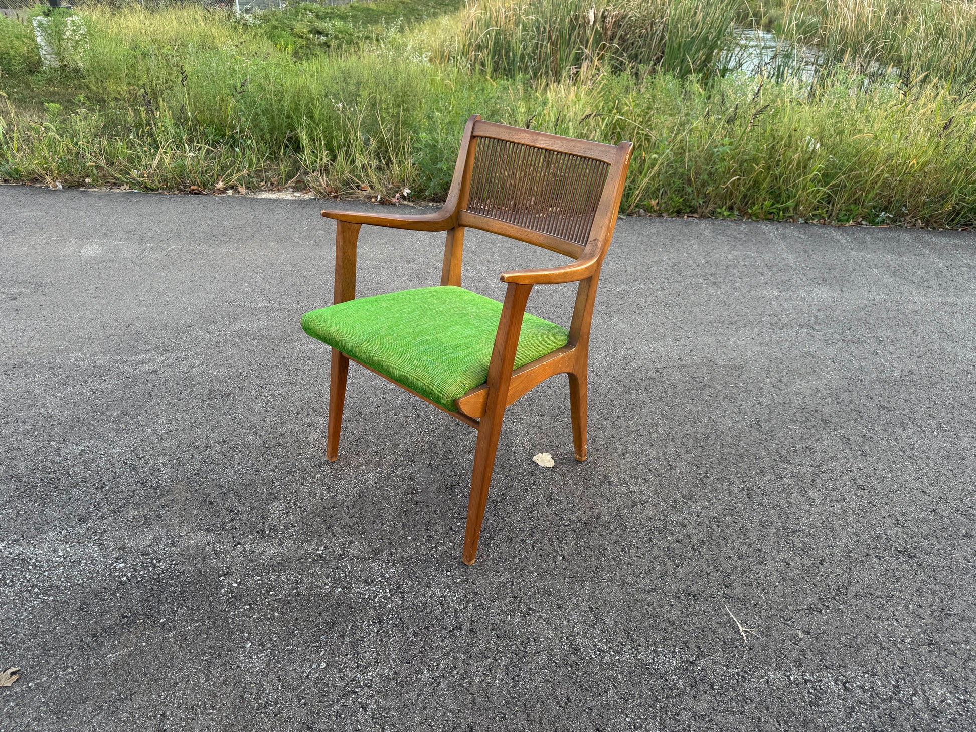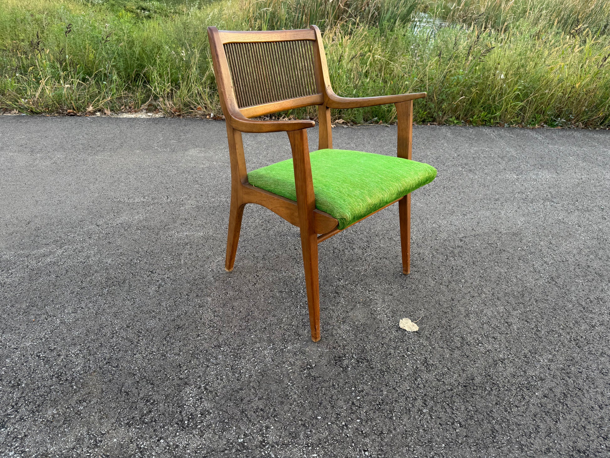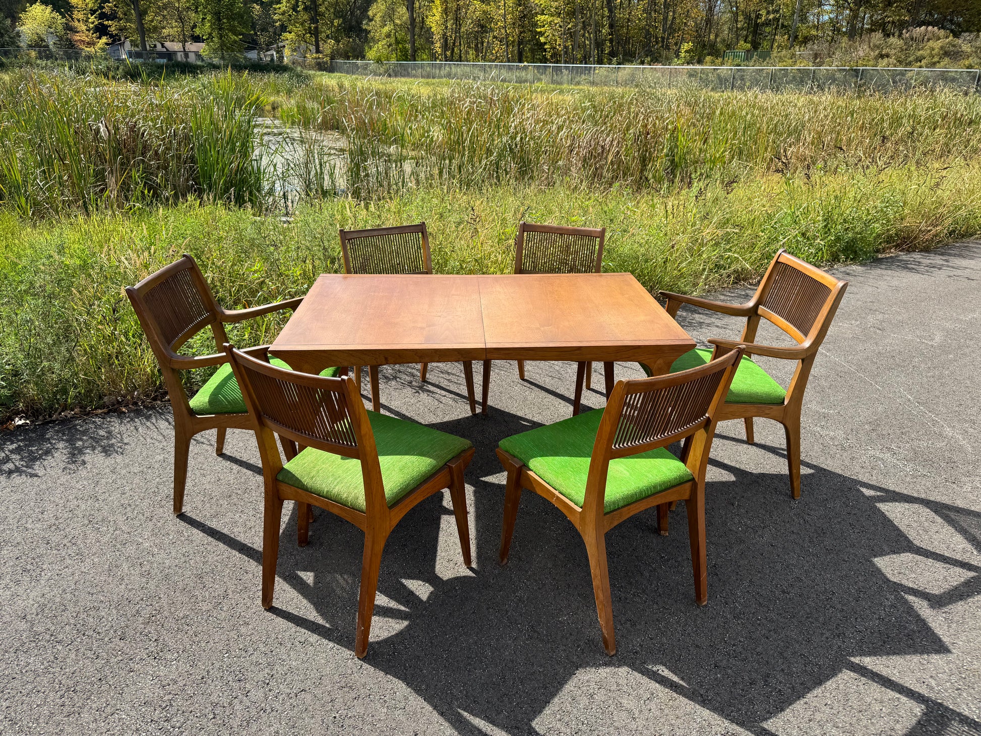 The chairs feature green upholstered seats, and the entire set displays the timeless warmth and sophistication of midcentury walnut design. The set will receive professional light cleaning, reconditioning, and finish restoration by Ohio Vintage prior to delivery—ensuring it’s ready to enjoy in your home while retaining its authentic patina.
