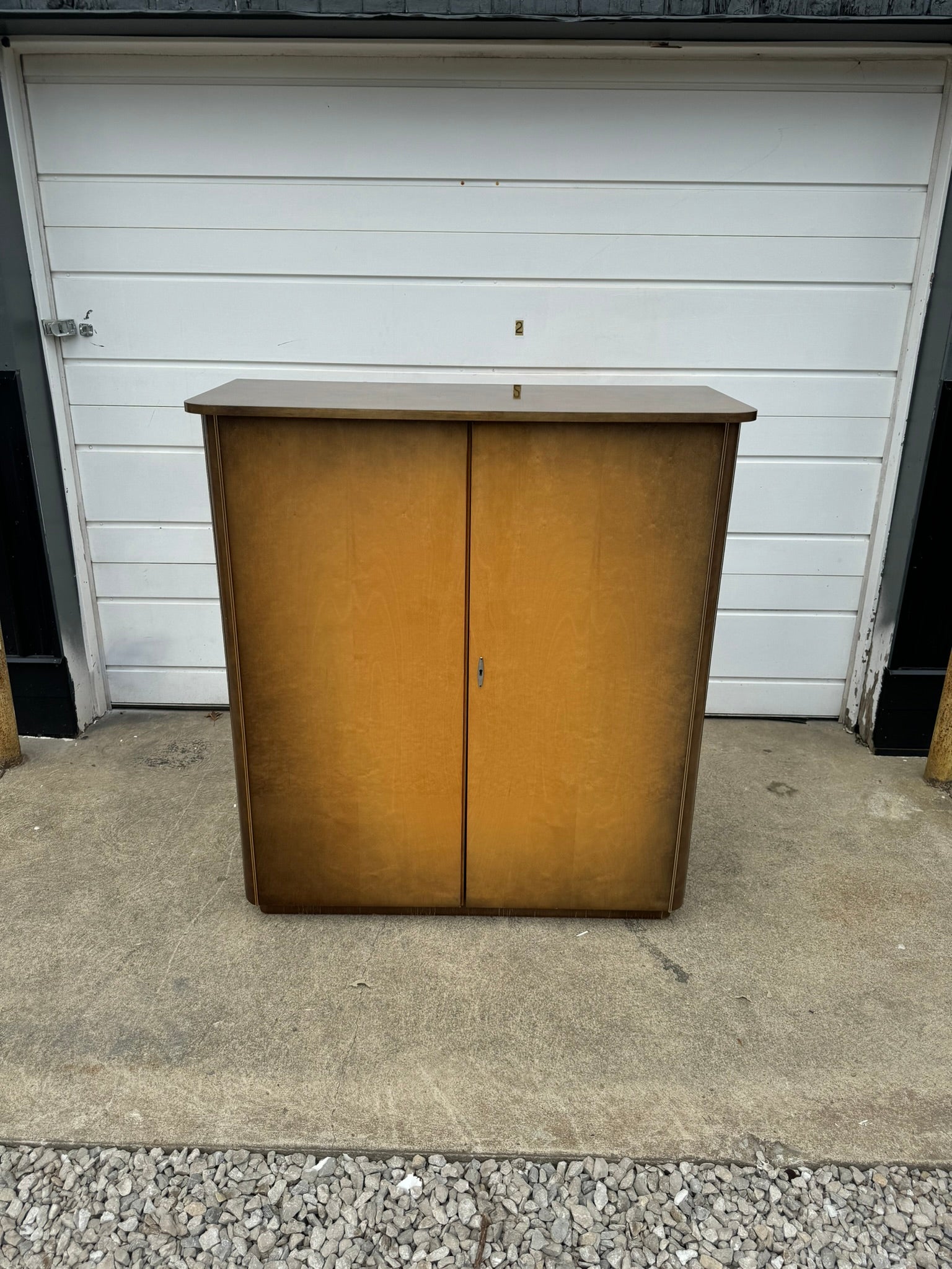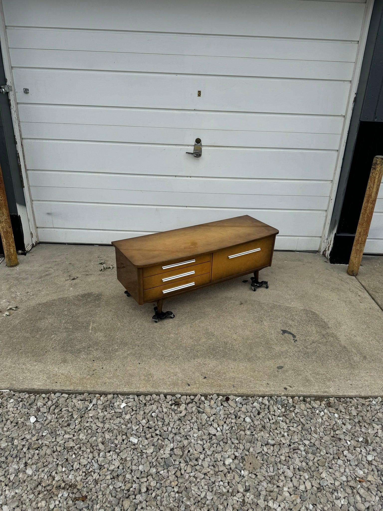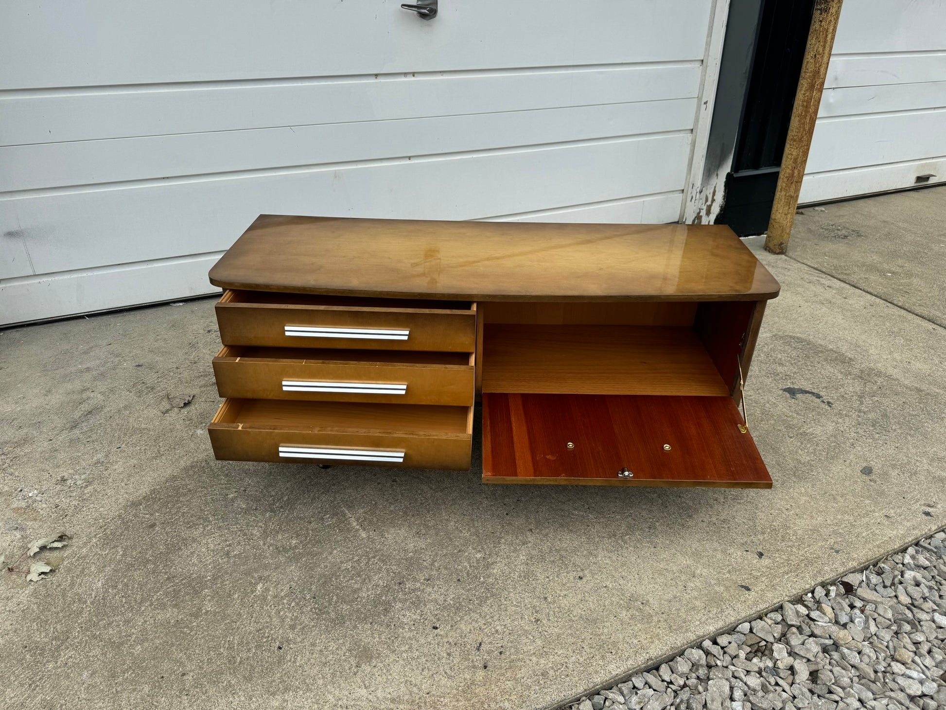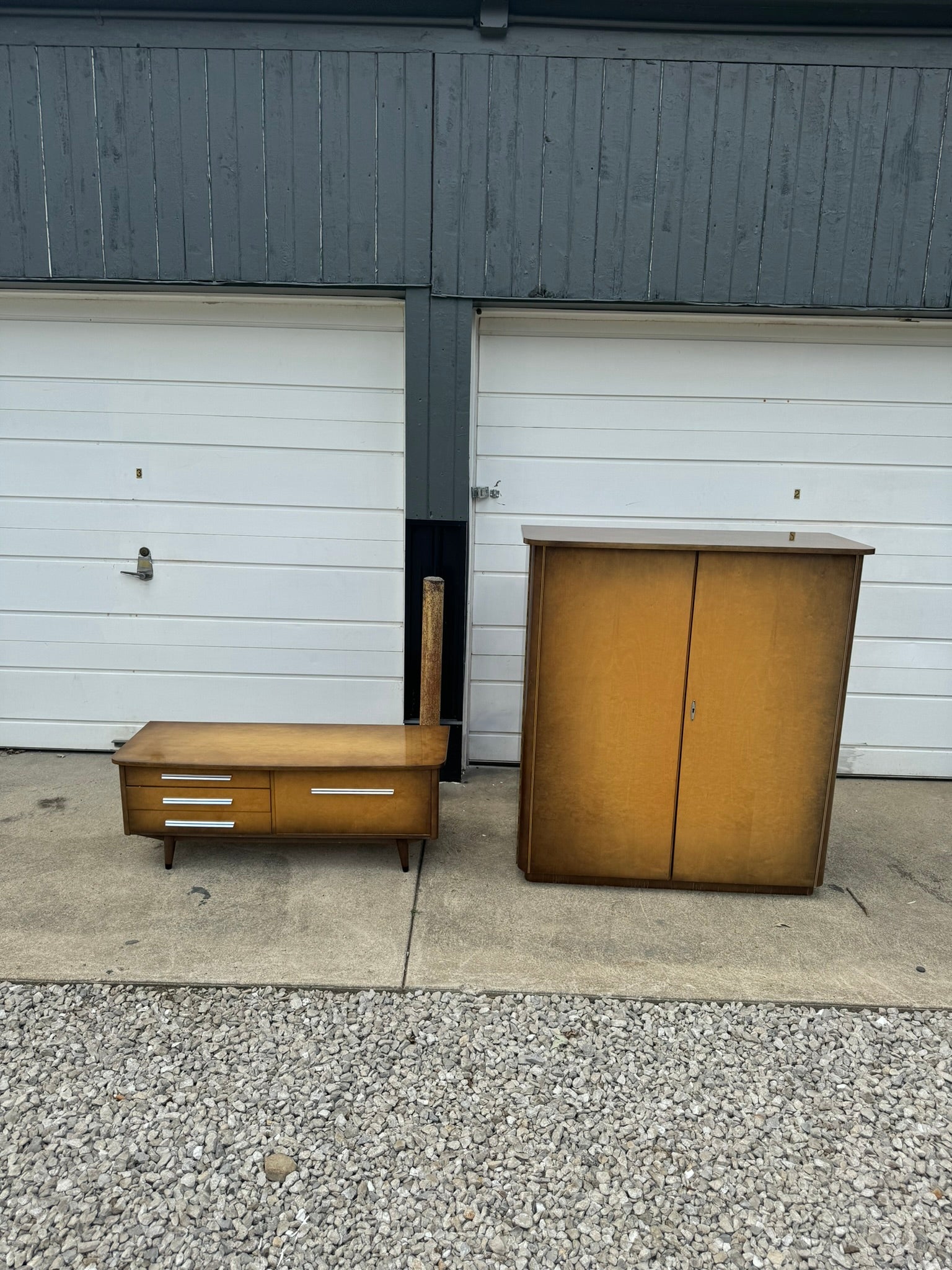 Elevate your living room with this sophisticated German Shrunk entertainment center set, featuring a sleek low console paired with a spacious storage cabinet. Crafted with precision and quality materials, this two-piece midcentury modern set offers both style and function—perfect for housing your media devices, books, and decorative items.