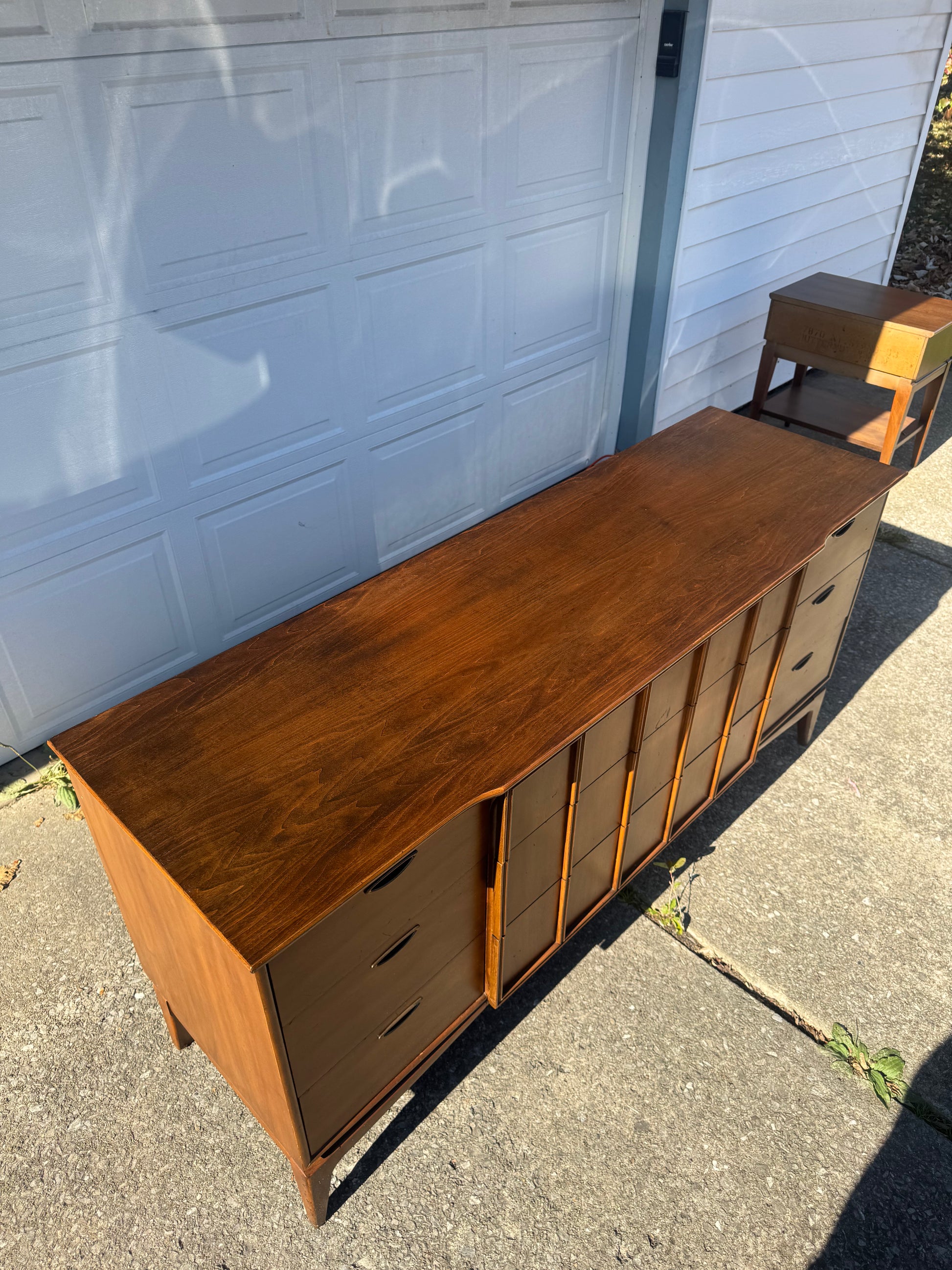 A beautiful Kent Coffey Parkway Series lowboy dresser, showcasing the sleek lines, warm walnut tones, and refined craftsmanship that define this iconic midcentury collection. With its long profile and sculptural detailing, this piece offers generous storage and timeless style — perfect for bedrooms, living spaces, or as a media console.