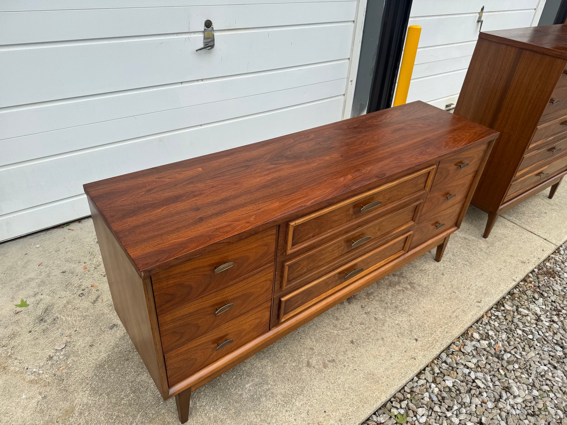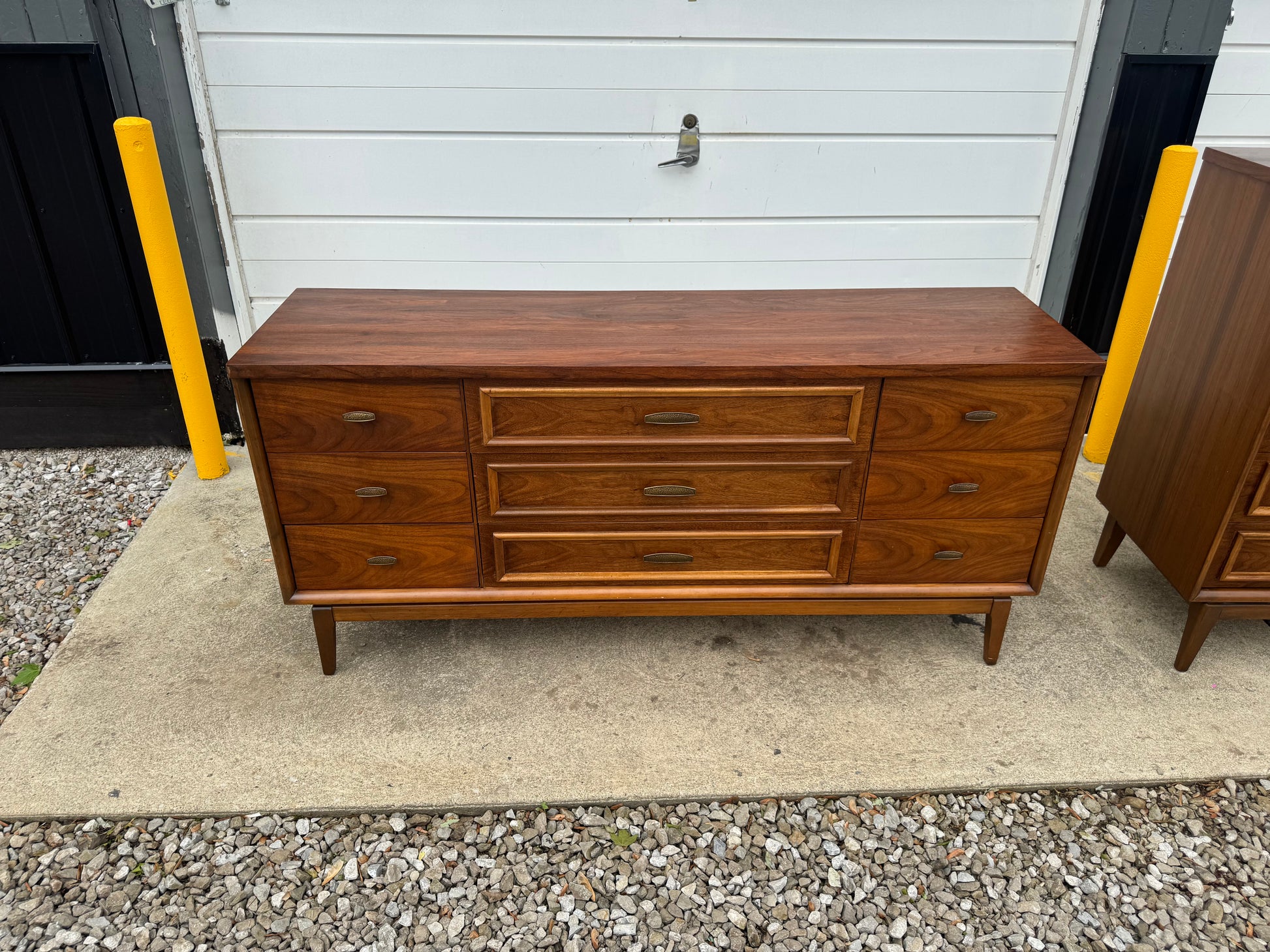 A timeless midcentury modern dresser set by Lenior House, newly refinished by Ohio Vintage to restore its original beauty and character. This elegant two-piece set includes a spacious lowboy dresser with its original mirror and a matching highboy chest of drawers, offering both style and generous storage.