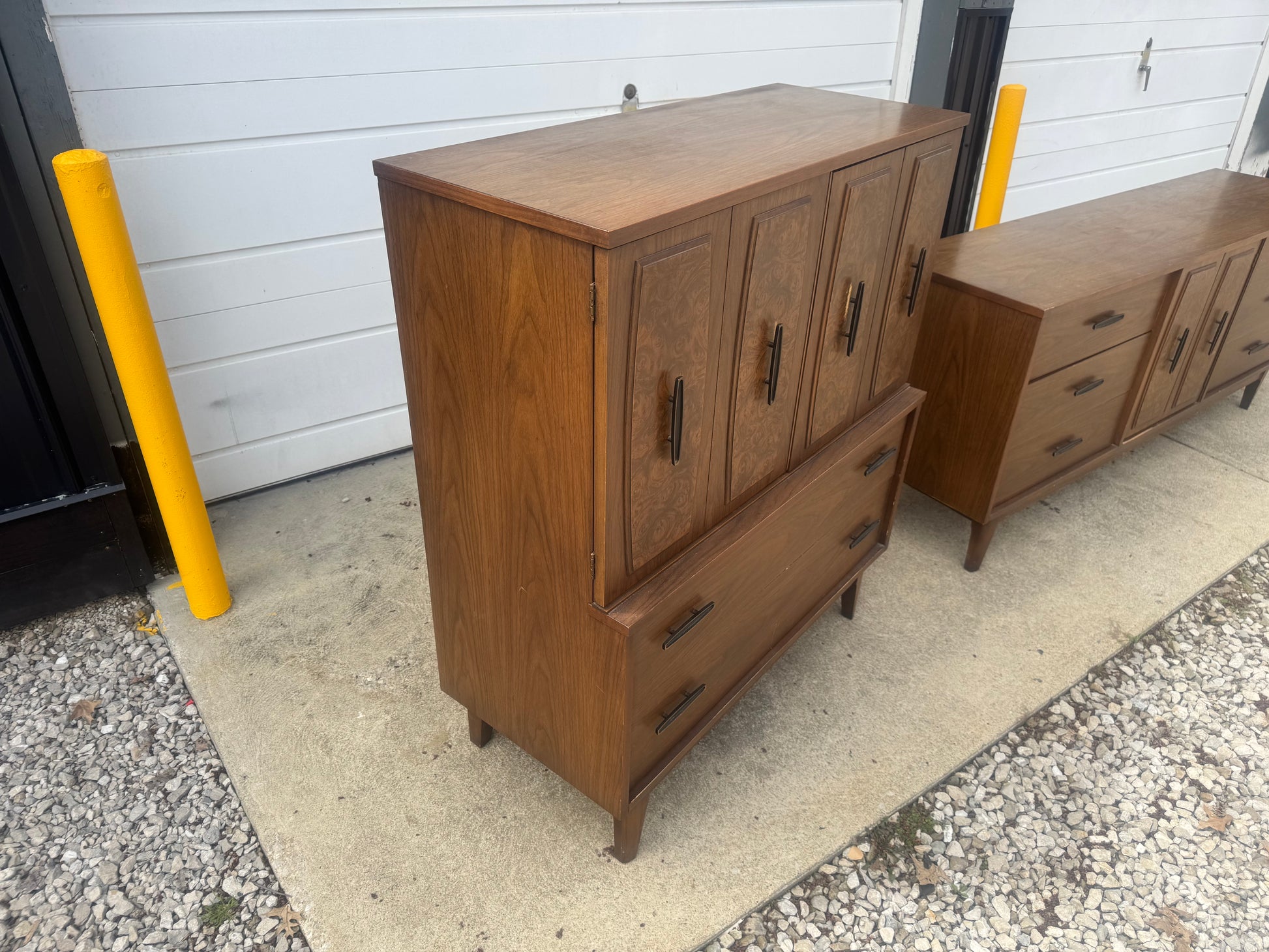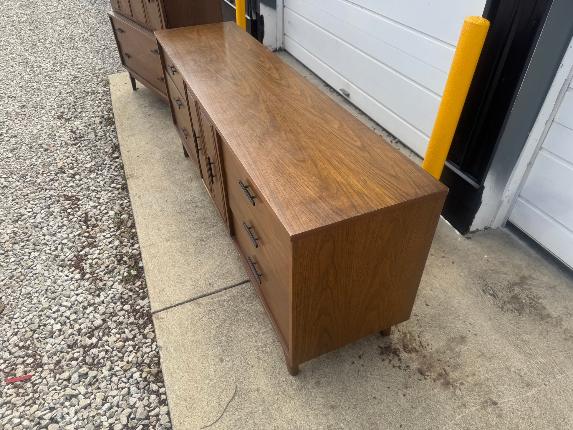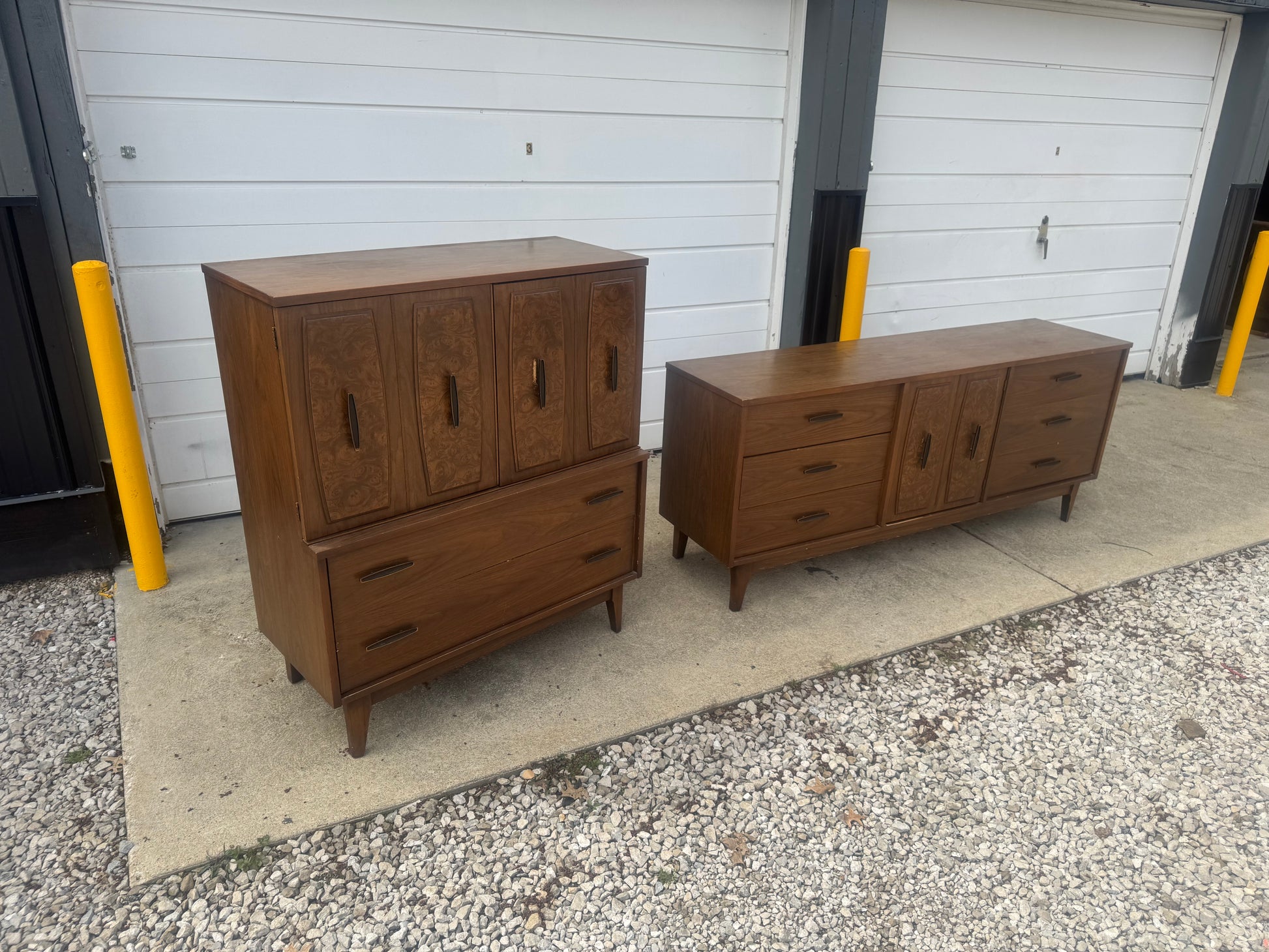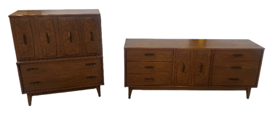 This vintage Lenoir House midcentury modern set includes a long nine-drawer dresser and a tall chest of drawers, both featuring clean lines, tapered legs, and a warm walnut finish. Built with quality and style, these pieces offer plenty of storage and that classic MCM charm.