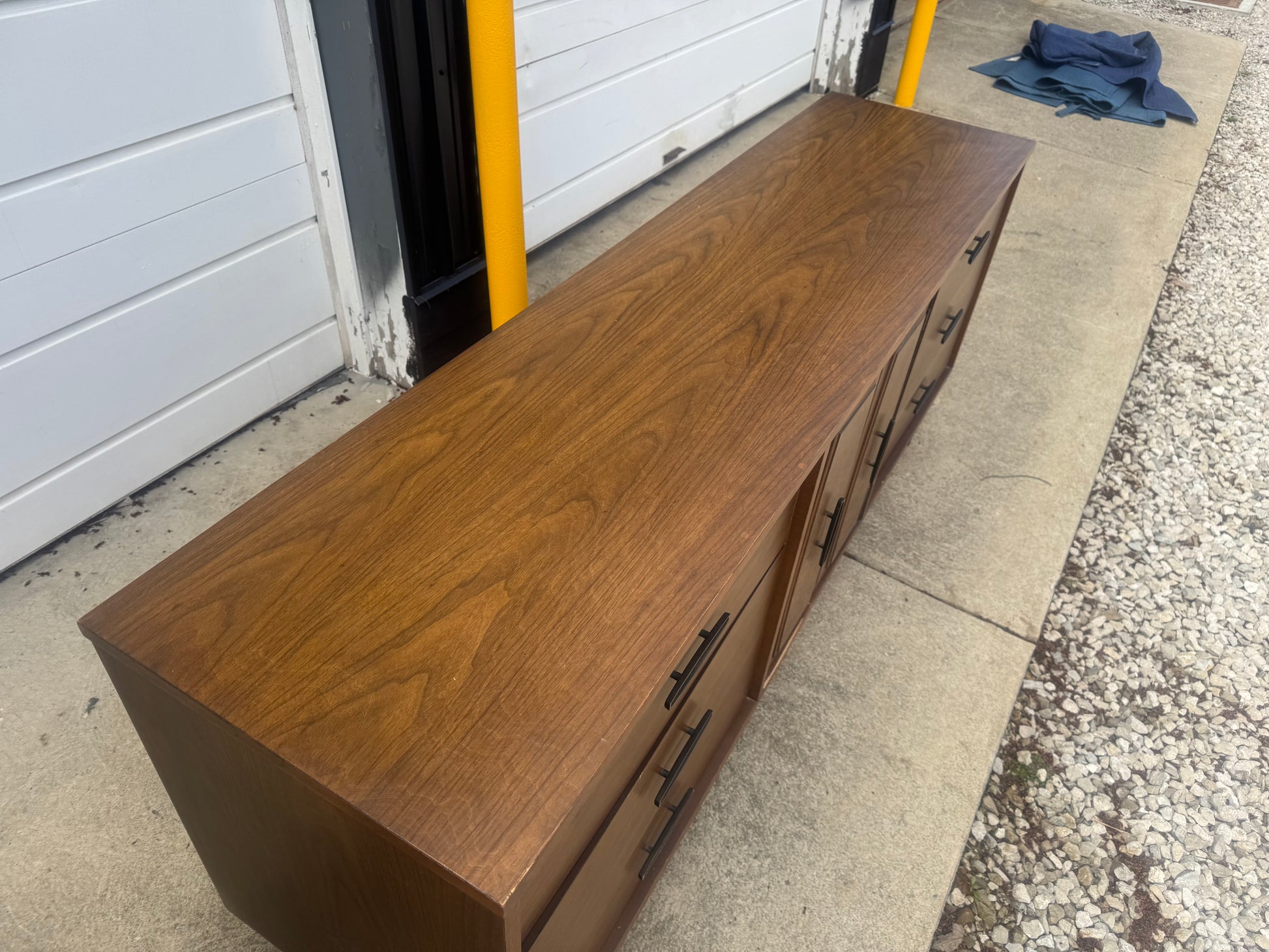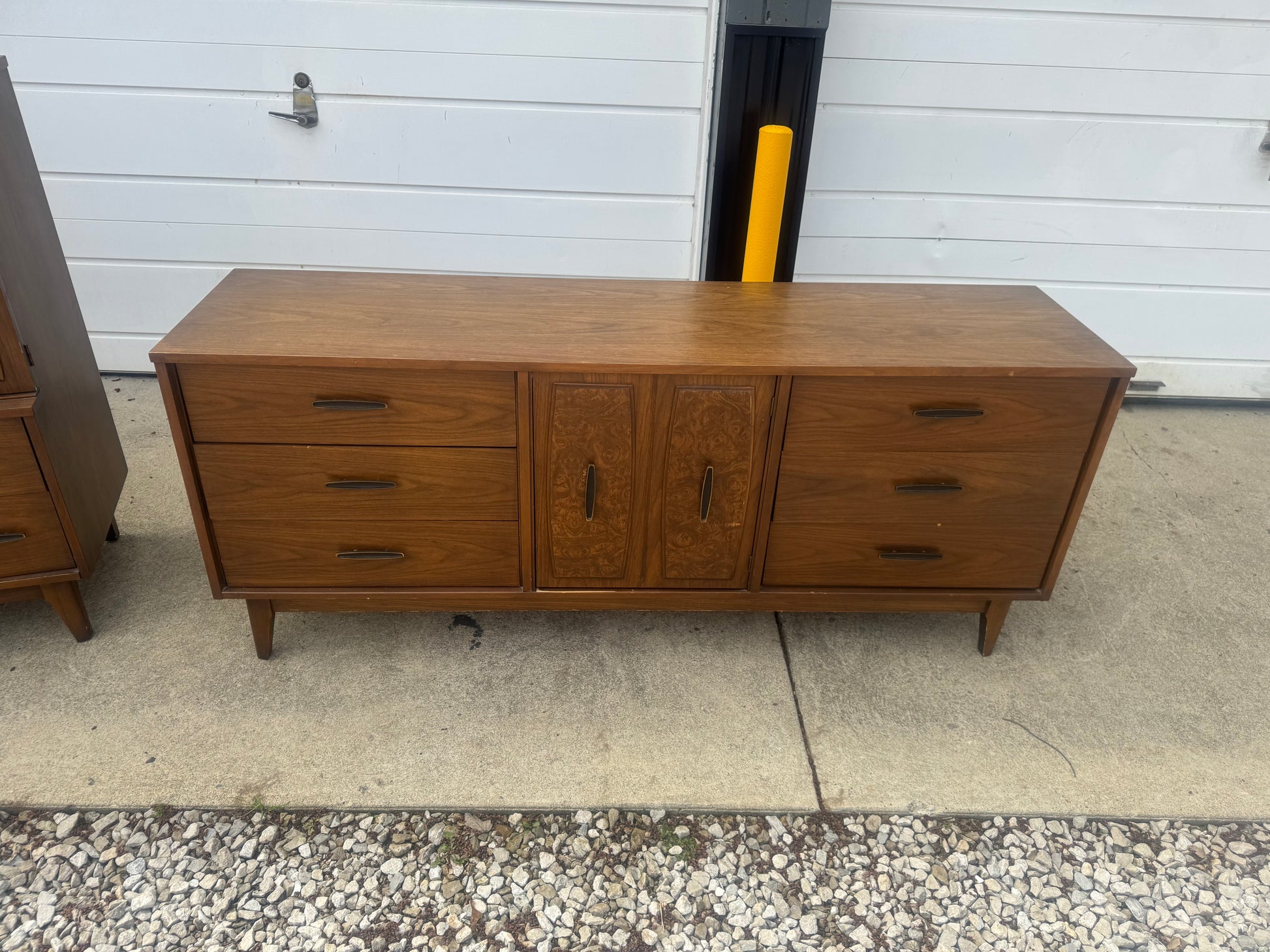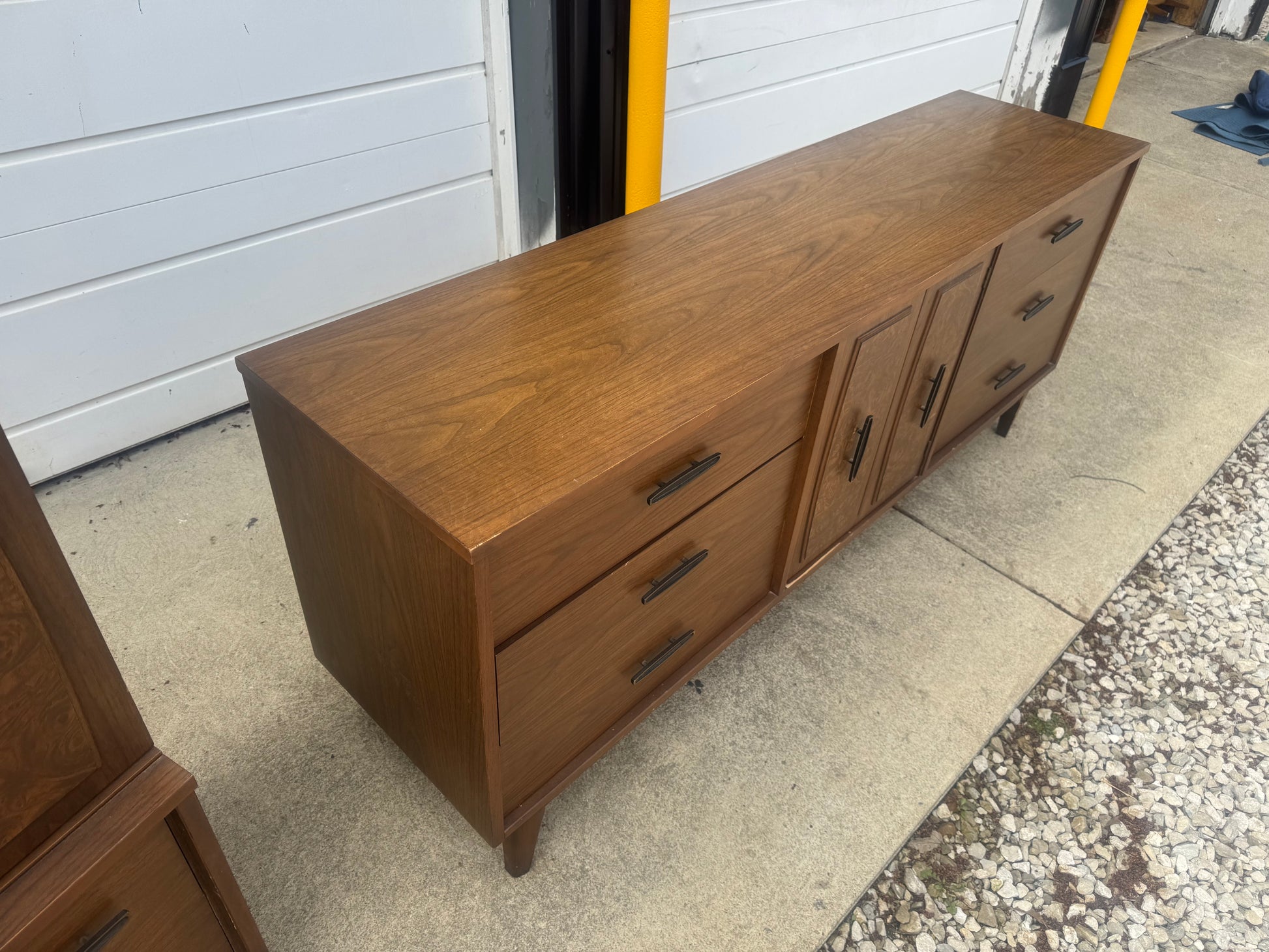 This vintage Lenoir House midcentury modern set includes a long nine-drawer dresser and a tall chest of drawers, both featuring clean lines, tapered legs, and a warm walnut finish. Built with quality and style, these pieces offer plenty of storage and that classic MCM charm.