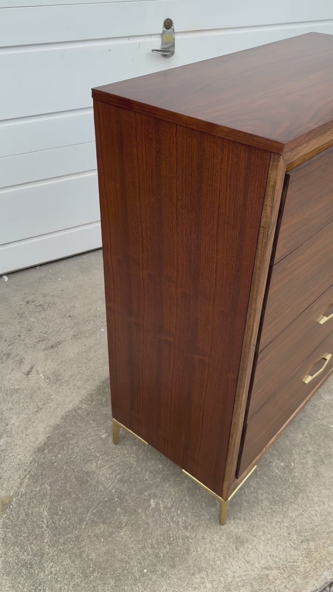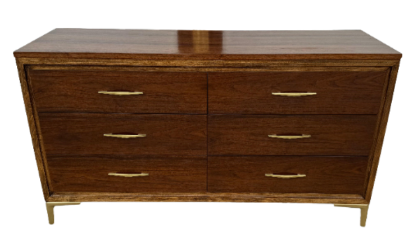 This elegant midcentury dresser offers a perfect balance of warmth, function, and style. Featuring a rich amber walnut tone and complemented by gold-finished legs and hardware, this six-drawer dresser makes a sophisticated statement while providing ample storage for any bedroom or living space.