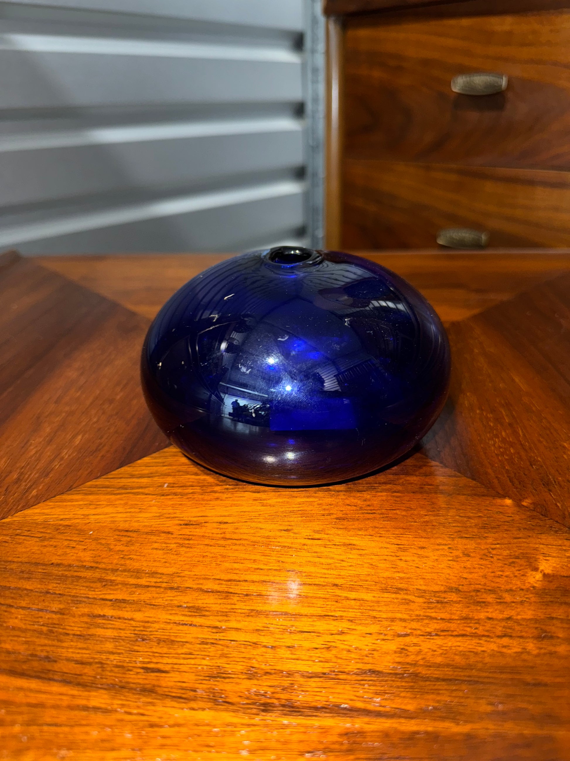 This vintage blue bud vase is the perfect accent for a single stem, small floral arrangement, or as a standalone decorative piece. Its compact size and striking color make it a versatile accessory for shelves, mantels, or tabletops.